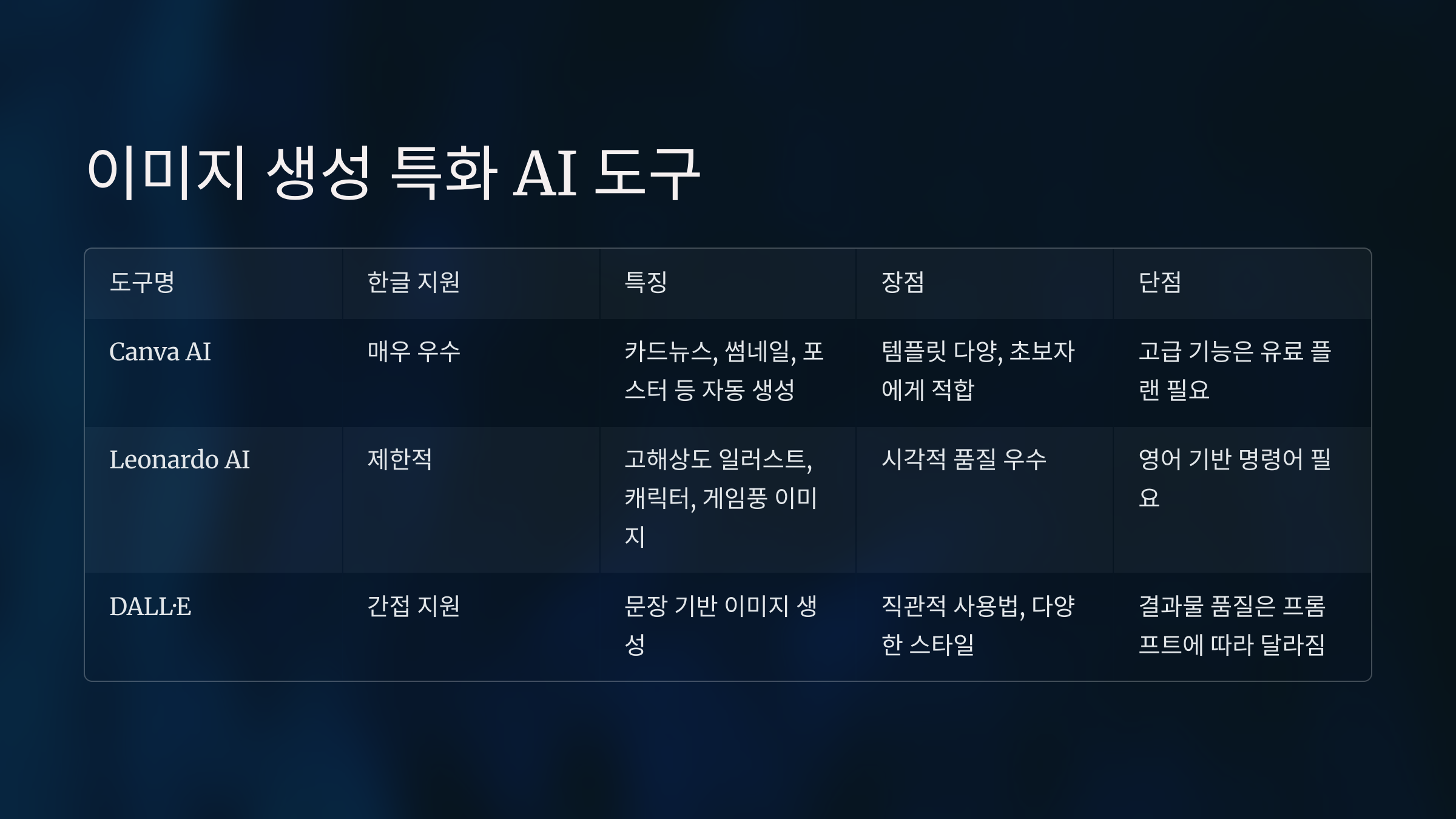 | 이미지 | Leonardo AI | 일러스트, 캐릭터 | 제한적 | 일정량 O | 시각 품질 높음 |